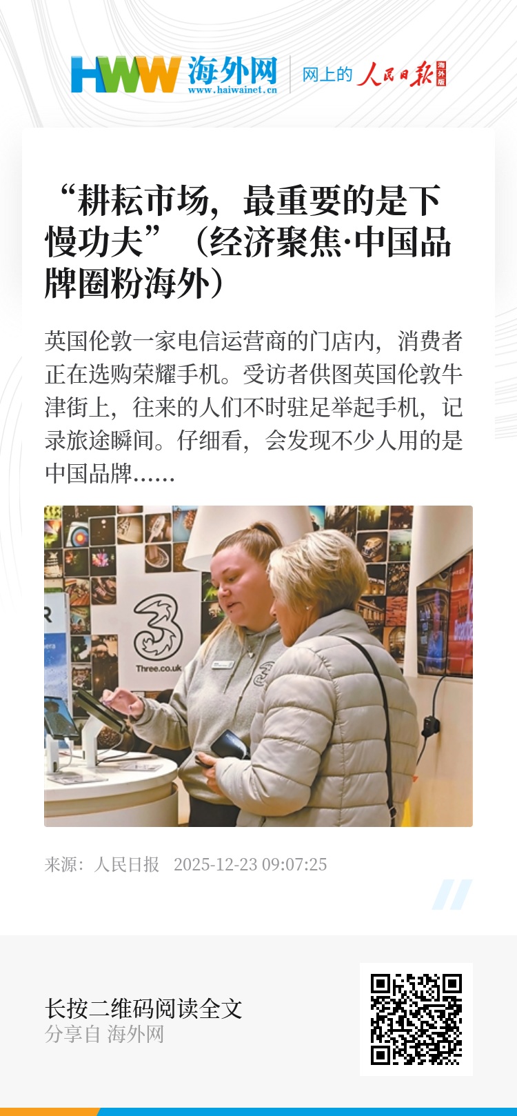 “信任是品牌出海的法宝之一,只有尊重并理解海外市场,才能赢得市场。”荣耀公司市场经理高翔介绍,公司已在英国、法国、德国、西班牙等近30个欧洲国家开展业务,除了手机,电脑、平板、智能手表等产品也全面进入国际市场。