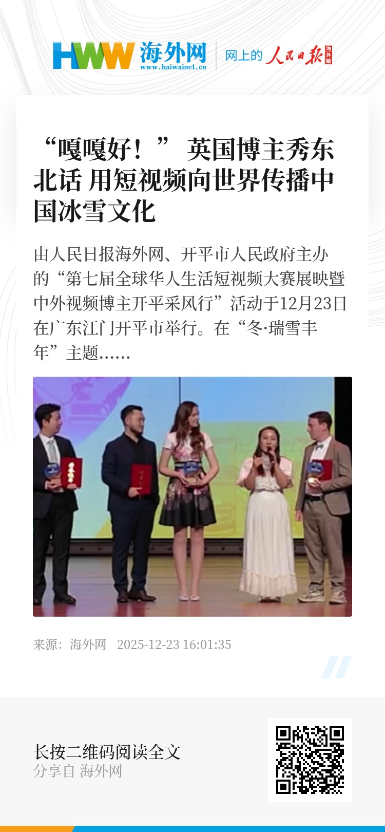 由人民日报海外网、开平市人民政府主办的“第七届全球华人生活短视频大赛展映暨中外视频博主开平采风行”活动于12月23日在广东江门开平市举行。在“冬·瑞雪丰年”主题作品展映环节,英国博主杰凯大秀东北话,称大赛办得“嘎嘎好”。