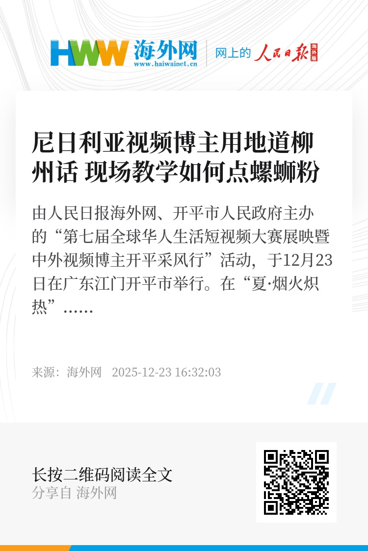 由人民日报海外网、开平市人民政府主办的“第七届全球华人生活短视频大赛展映暨中外视频博主开平采风行”活动,于12月23日在广东江门开平市举行。在“夏·烟火炽热”主题作品展映环节,尼日利亚视频博主小黑用地道柳州话教现场嘉宾点螺蛳粉。