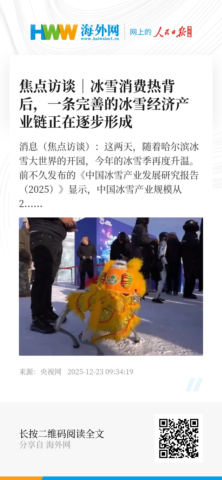 央视网消息(焦点访谈):这两天,随着哈尔滨冰雪大世界的开园,今年的冰雪季再度升温。前不久发布的《中国冰雪产业发展研究报告(2025)》显示,中国冰雪产业规模从2015年的2700亿元持续增长至2024年的9800亿元,预计2025年将首次突破万亿元大关。今年这个冬天,冰雪运动更加丰富多样,从北方到南方,从传统冰雪项目到层出不穷的“冰雪+”新场景,带动了消费,更带动了国产装备制造、目的地运营、旅游服务等全产业链的蓬勃发展。