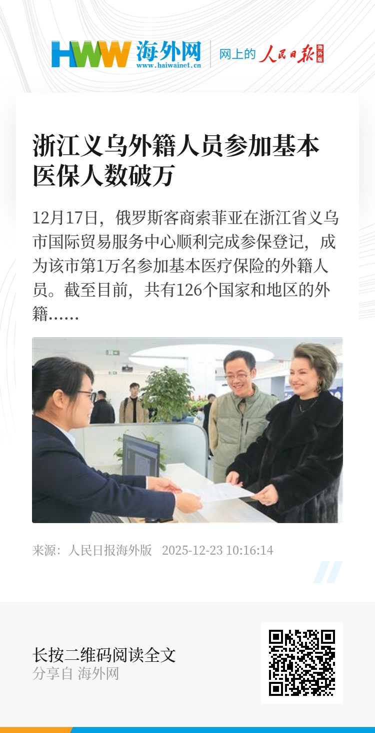 “我们特别开发了专属外籍人员的参保编码,参保登记等8项高频业务已全面下沉到医院和外国人聚居的‘国际社区’,并依托‘外国人一件事’平台实现工作许可与医保登记同步办理。”义乌市政府相关负责人表示。