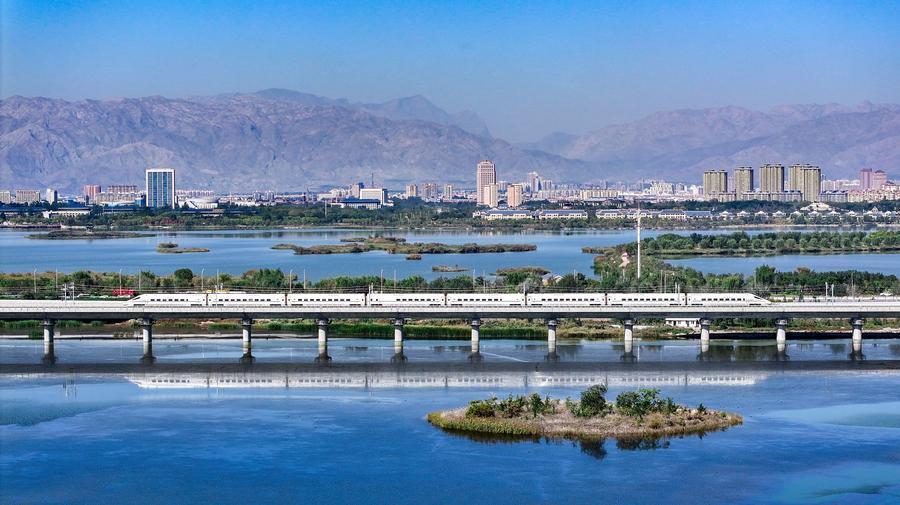 一列动车组列车行驶在包银高铁惠银段石嘴山特大桥上。新华社记者 冯开华 摄