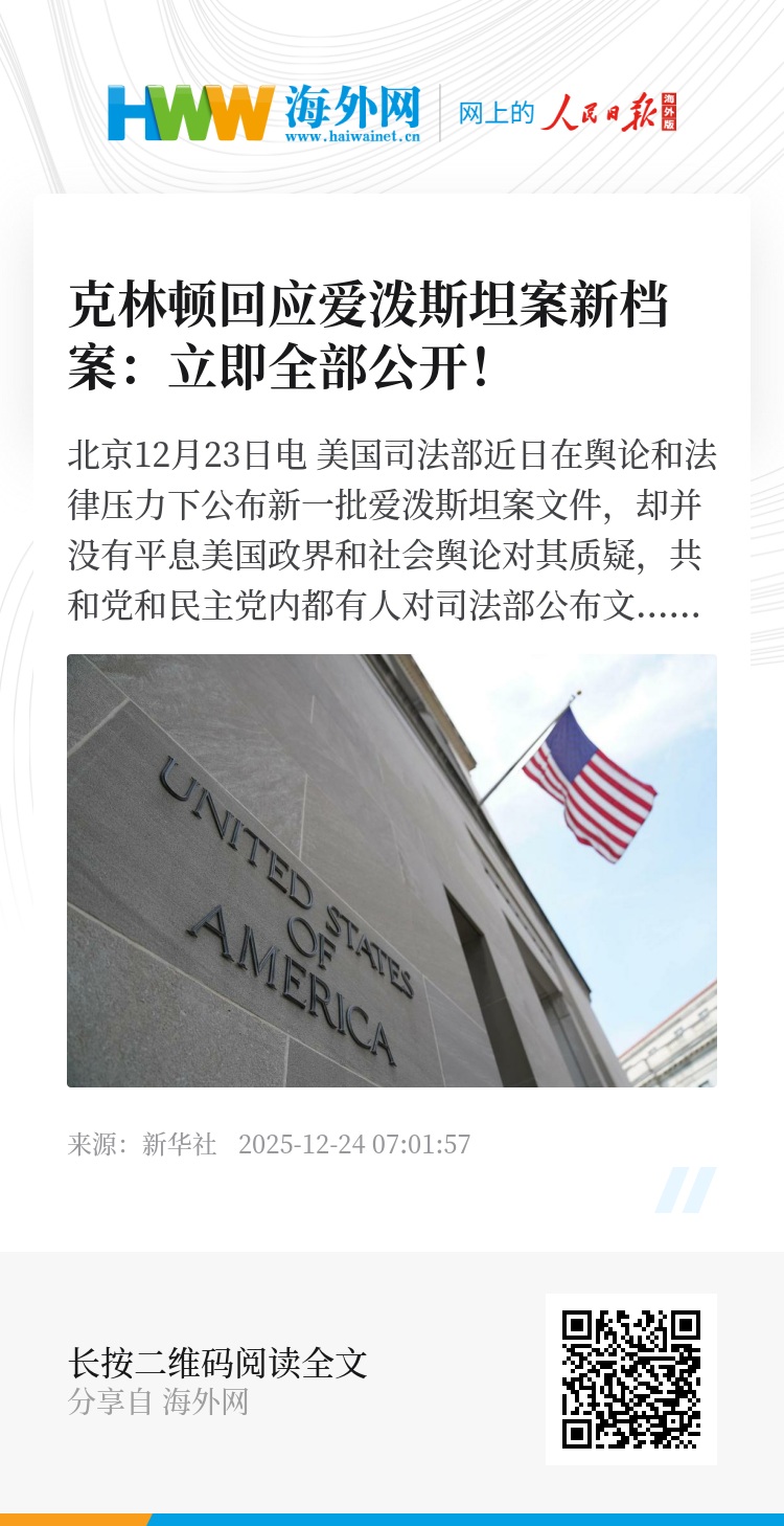 克林顿22日通过发言人安杰尔·乌雷尼亚发表声明,敦促司法部长邦迪“立即公布”爱泼斯坦案剩余文件中任何涉及他本人的材料、包括照片。“某人或某事受到保护,我们不知道是什么人、什么事或什么缘故,但我们确实知道一点,就是我们不需要这种保护。”乌雷尼亚说。