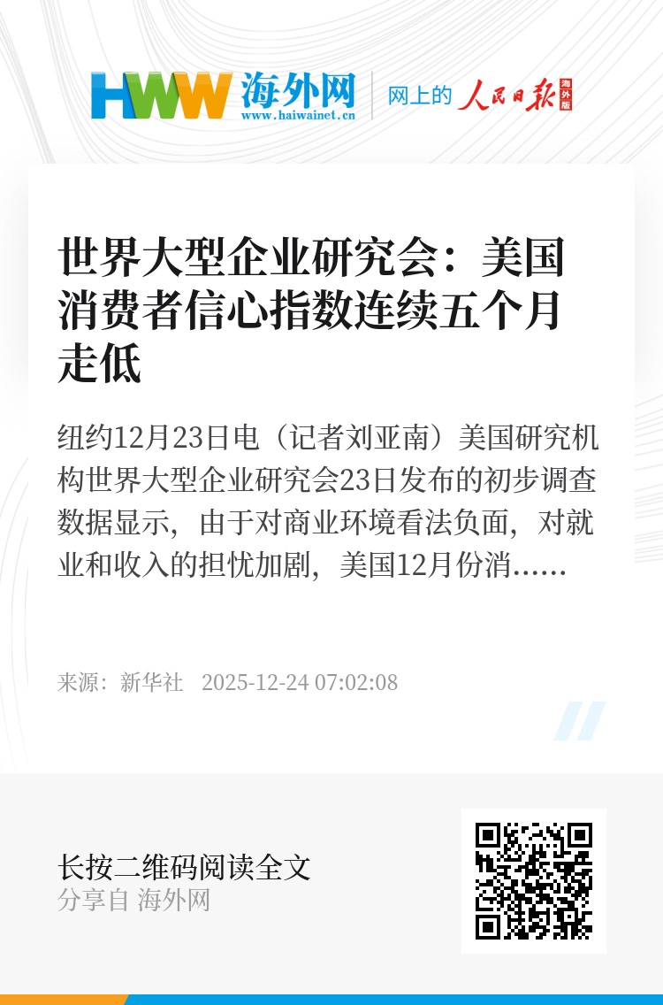 世界大型企业研究会首席经济学家达娜·彼得森表示,尽管11月的数据因联邦政府“停摆”结束而被向上修正,12月消费者信心再次下滑并依然远低于今年1月的峰值。消费者信心指数5个成分指数中有4个出现下降,另一个表现明显疲弱。