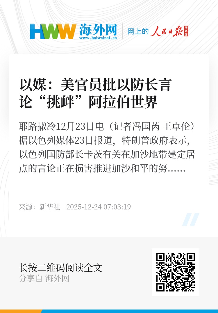 新华社耶路撒冷12月23日电(记者冯国芮 王卓伦)据以色列媒体23日报道,特朗普政府表示,以色列国防部长卡茨有关在加沙地带建定居点的言论正在损害推进加沙和平的努力,并可能削弱阿拉伯国家与以方的合作意愿。
