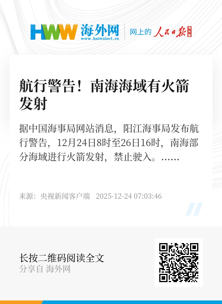 据中国海事局网站消息,阳江海事局发布航行警告,12月24日8时至26日16时,南海部分海域进行火箭发射,禁止驶入。