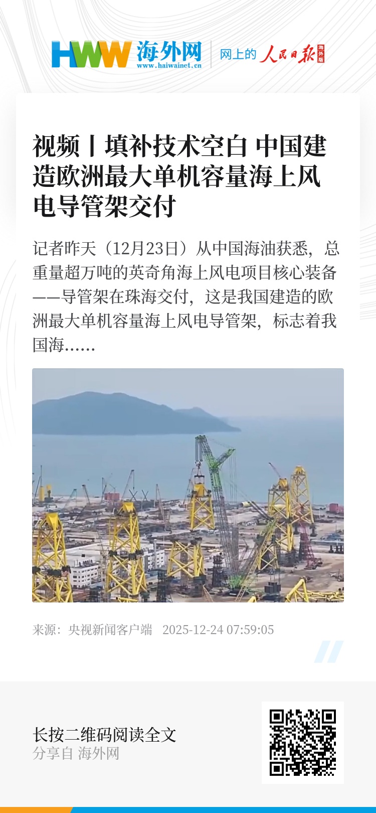 记者昨天(12月23日)从中国海油获悉,总重量超万吨的英奇角海上风电项目核心装备——导管架在珠海交付,这是我国建造的欧洲最大单机容量海上风电导管架,标志着我国海上风电类产品核心建造能力获得重要突破。
