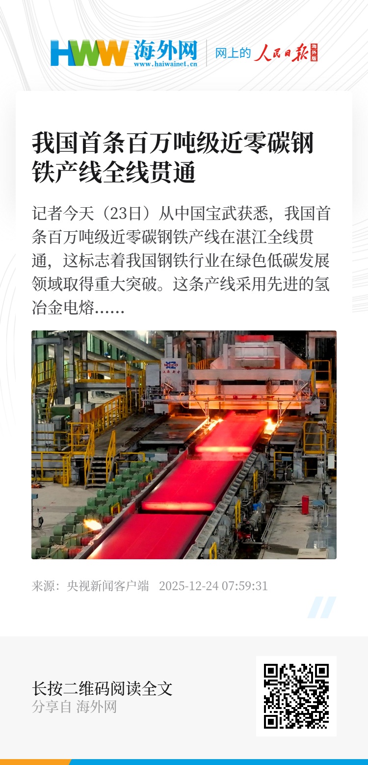 记者今天(23日)从中国宝武获悉,我国首条百万吨级近零碳钢铁产线在湛江全线贯通,这标志着我国钢铁行业在绿色低碳发展领域取得重大突破。