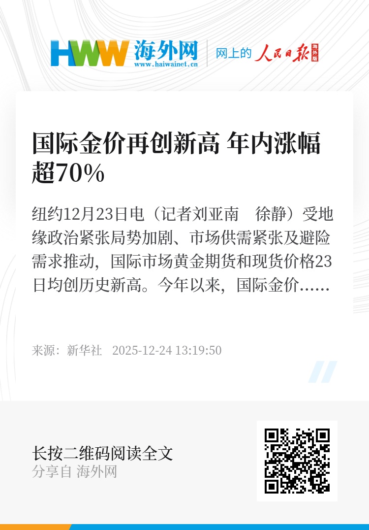 新华社纽约12月23日电(记者刘亚南 徐静)受地缘政治紧张局势加剧、市场供需紧张及避险需求推动,国际市场黄金期货和现货价格23日均创历史新高。今年以来,国际金价累计涨幅已超过70%。