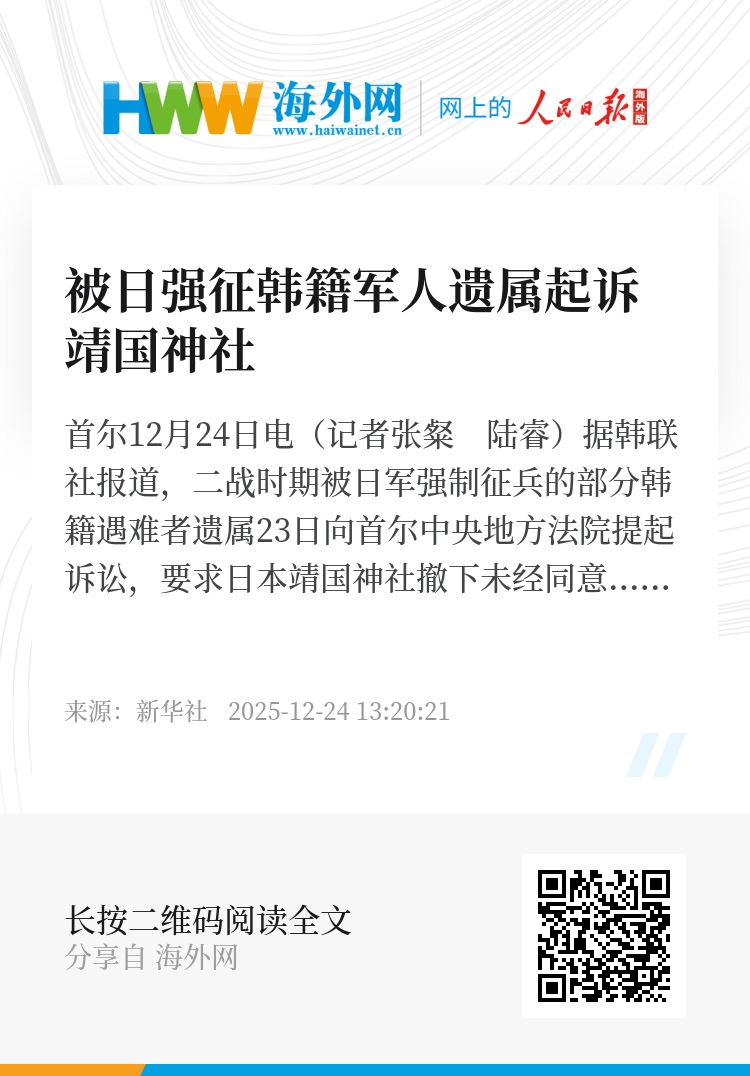 新华社首尔12月24日电(记者张粲 陆睿)据韩联社报道,二战时期被日军强制征兵的部分韩籍遇难者遗属23日向首尔中央地方法院提起诉讼,要求日本靖国神社撤下未经同意合祀的先人牌位,并向日本政府及靖国神社索赔8.8亿韩元(约合420万元人民币)。