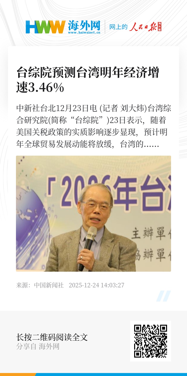中新社台北12月23日电 (记者 刘大炜)台湾综合研究院(简称“台综院”)23日表示,随着美国关税政策的实质影响逐步显现,预计明年全球贸易发展动能将放缓,台湾的出口也将承压;内需方面,在高基期因素影响下,台湾民间投资增长幅度将趋缓。台湾明年经济发展仍需审慎看待,预测全年经济增长率为3.46%。