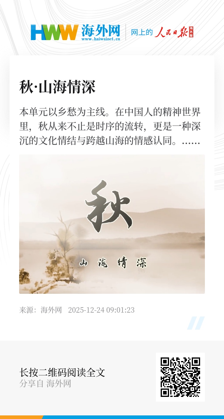 本单元以乡愁为主线。在中国人的精神世界里,秋从来不止是时序的流转,更是一种深沉的文化情结与跨越山海的情感认同。