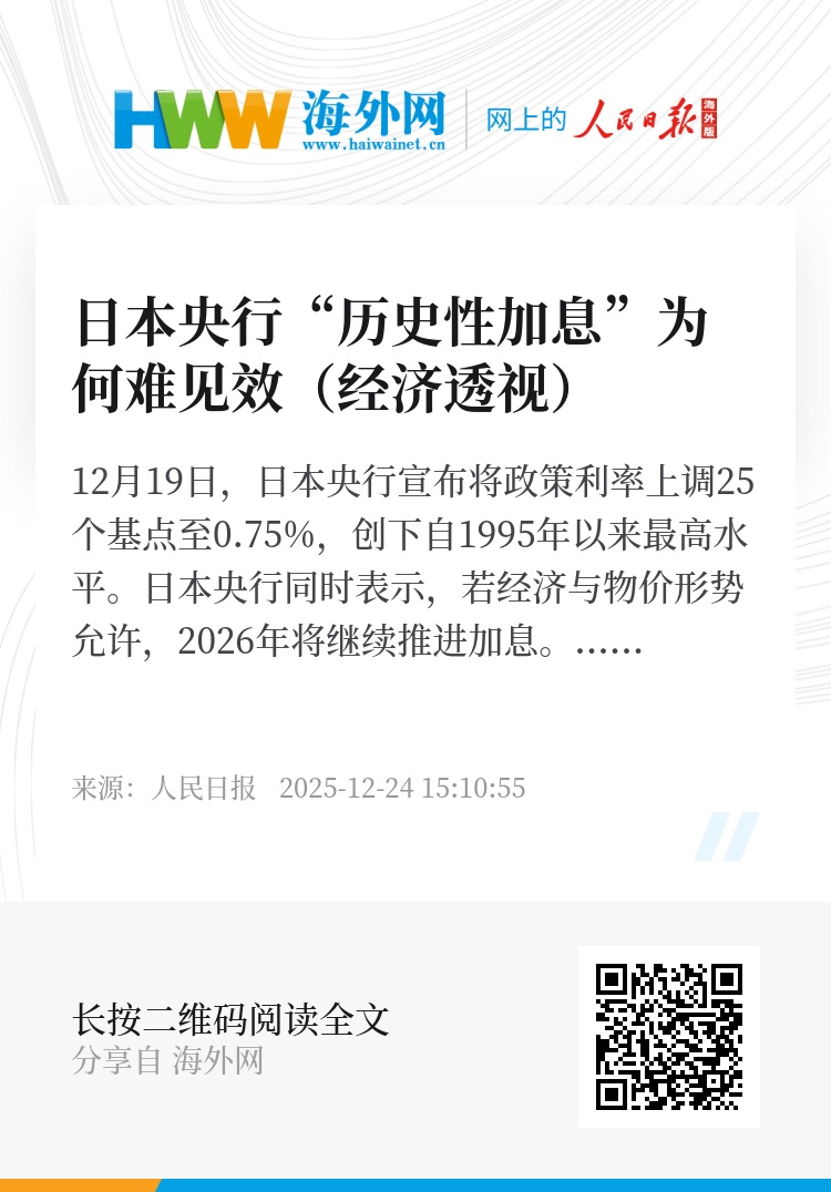 12月19日,日本央行宣布将政策利率上调25个基点至0.75%,创下自1995年以来最高水平。日本央行同时表示,若经济与物价形势允许,2026年将继续推进加息。这一被视为“历史性”的政策调整,旨在应对持续高企的通胀并稳定疲软的日元汇率,但市场反应颇为冷淡——加息当日,日元兑美元汇率继续下跌,颓势未改。这一局面折射出日本宏观经济政策面临的深层矛盾与结构性困境。