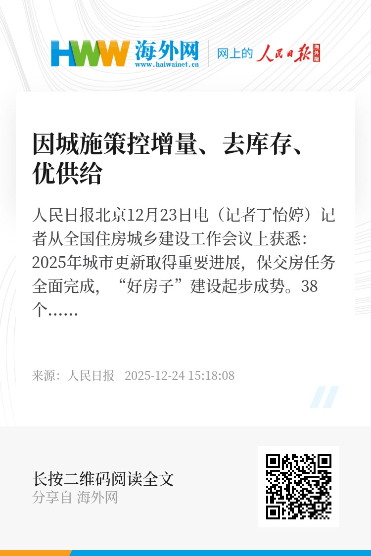 人民日报北京12月23日电(记者丁怡婷)记者从全国住房城乡建设工作会议上获悉:2025年城市更新取得重要进展,保交房任务全面完成,“好房子”建设起步成势。38个城市开展老旧住房自主更新、原拆原建,42个城市实施房屋全生命周期安全管理制度试点。完成106个完整社区试点,建设改造养老、托育等各类服务设施2000多个,新增停车位2.6万个,增补提升公共活动场地和公共绿地71.3万平方米。