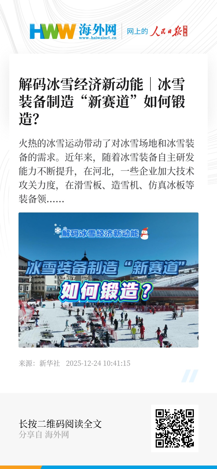 近年来,随着冰雪装备自主研发能力不断提升,在河北,一些企业加大技术攻关力度,在滑雪板、造雪机、仿真冰板等装备领域实现突破。