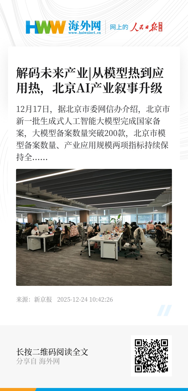 12月17日,据北京市委网信办介绍,北京市新一批生成式人工智能大模型完成国家备案,大模型备案数量突破200款,北京市模型备案数量、产业应用规模两项指标持续保持全国首位。