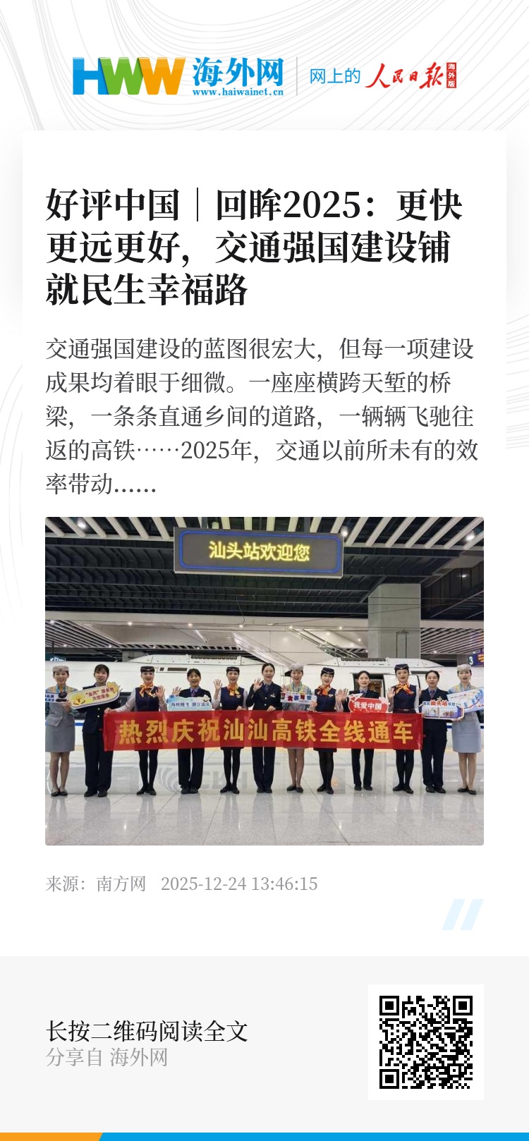 回望2025年,从“越来越快”到“走得更远”再到“体验更好”,我们见证了交通大国向交通强国的蝶变。当铁轨日益缩小区域差距,当航线不断延伸向世界舞台,当服务更加契合点滴需求,交通不再是冰冷的基础设施与遥远的宏大叙事,而是成为了民族复兴的道路、民生幸福的桥梁,我们将在每一次更从容的出发与更安心的抵达中,深切品味交通强国的意义。