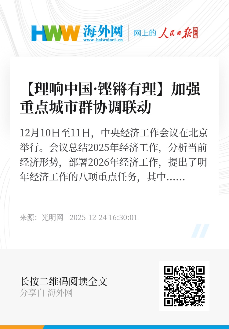 12月10日至11日,中央经济工作会议在北京举行。会议总结2025年经济工作,分析当前经济形势,部署2026年经济工作,提出了明年经济工作的八项重点任务,其中一项任务要求“坚持协调发展,促进城乡融合和区域联动”,并强调“加强重点城市群协调联动”。