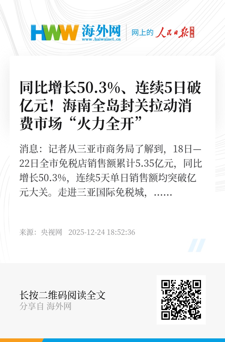 为迎接封关这一重要节点,三亚市免税店纷纷推出丰富促销活动,全方位让利消费者。12月18日封关首日,三亚国际免税店进店客流超3.6万人次,同比增长超60%;销售额同比大涨85%,直观展现出全岛封关对消费市场的强劲拉动作用。
