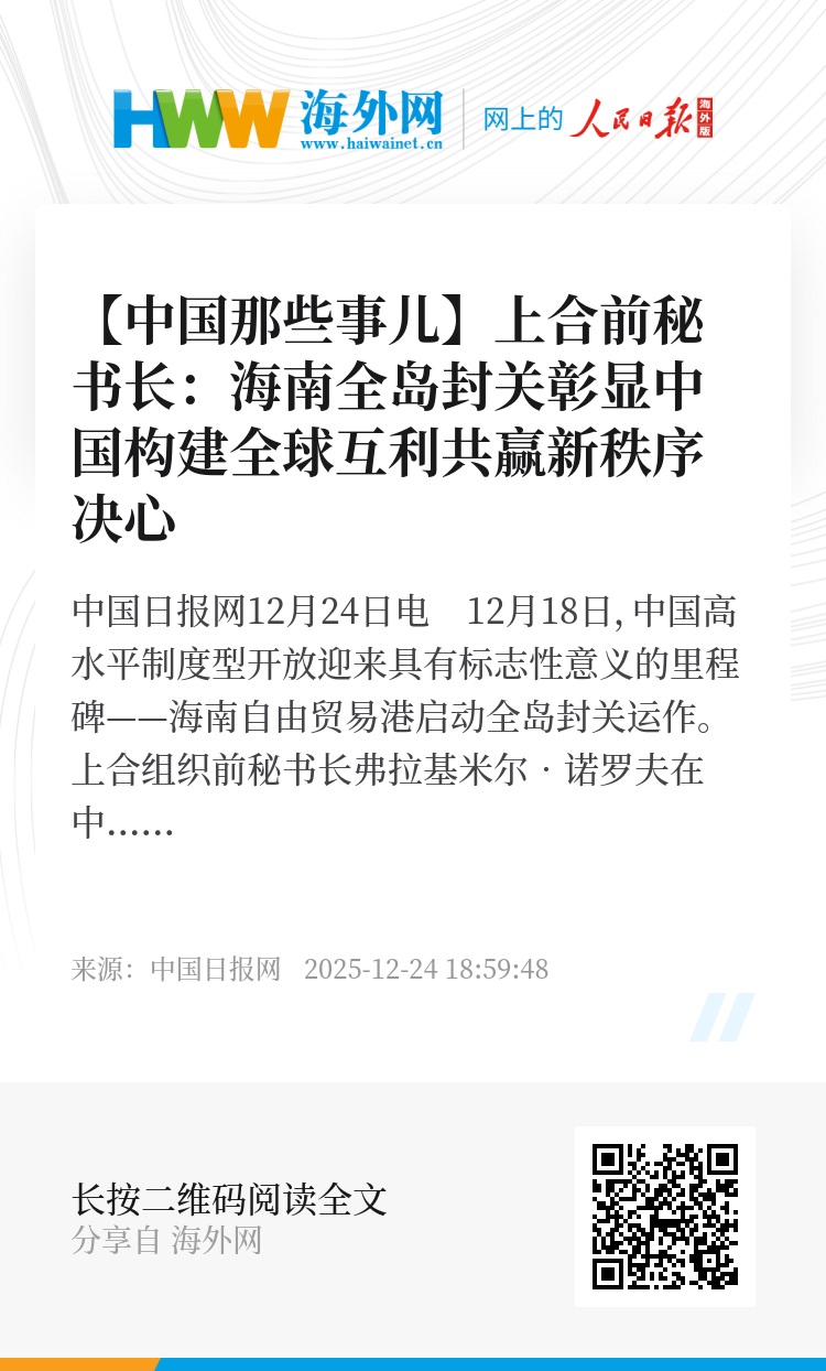 上合组织前秘书长弗拉基米尔•诺罗夫在中国日报网撰文指出,这不仅仅是一项海关制度的创新,更是中国特色自由贸易港建设进入成熟阶段的生动体现,彰显了中国以更积极姿态融入全球经济、塑造互利共赢秩序的坚定决心。