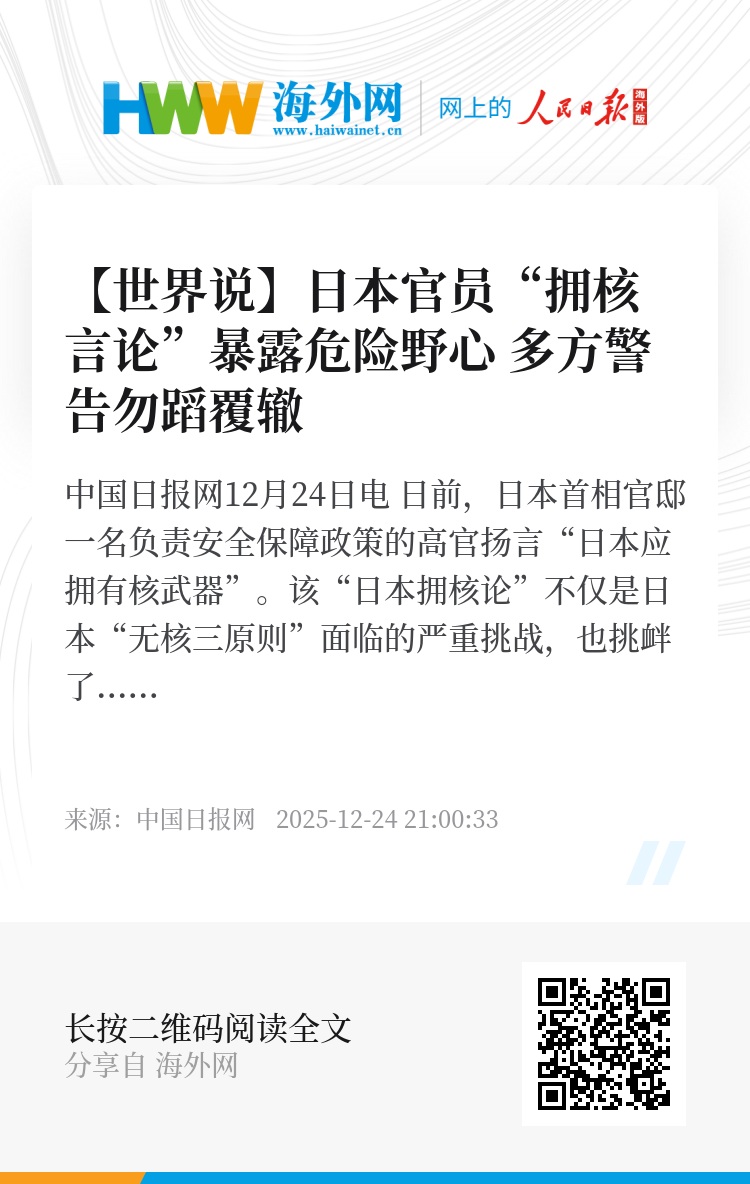 中国日报网12月24日电 日前,日本首相官邸一名负责安全保障政策的高官扬言“日本应拥有核武器”。该“日本拥核论”不仅是日本“无核三原则”面临的严重挑战,也挑衅了国际核不扩散体系以及战后国际秩序,更暴露了军国主义死灰复燃的危险动向。这一狂言遭到日本国内外的多方批评与反对。