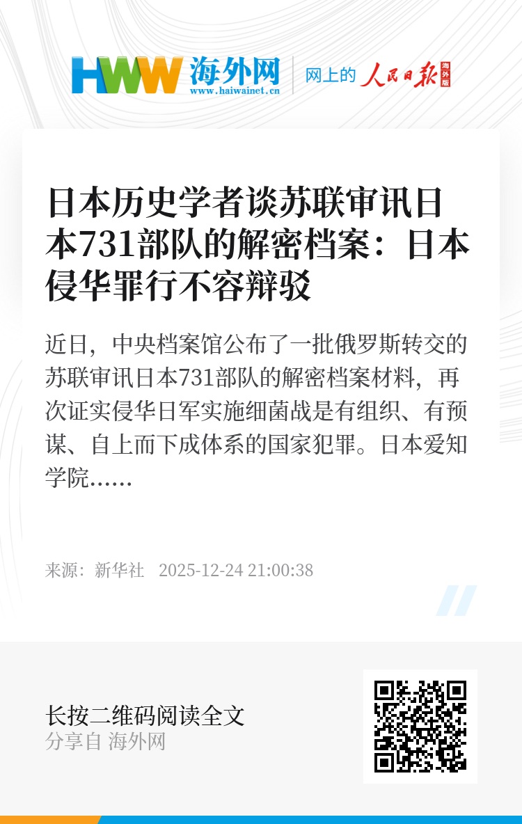 近日,中央档案馆公布了一批俄罗斯转交的苏联审讯日本731部队的解密档案材料,再次证实侵华日军实施细菌战是有组织、有预谋、自上而下成体系的国家犯罪。日本爱知学院大学文学部历史学科副教授广中一成日前在接受新华社记者专访时表示,日本侵华罪行不容辩驳,此次公布的档案对于进一步揭露731部队的罪行具有重要意义。