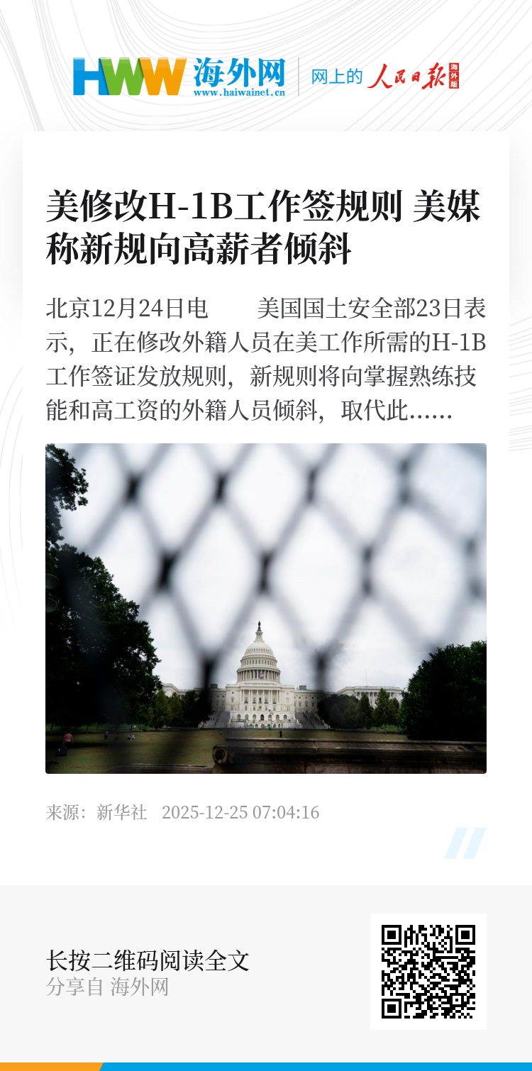 新华社北京12月24日电 美国国土安全部23日表示,正在修改外籍人员在美工作所需的H-1B工作签证发放规则,新规则将向掌握熟练技能和高工资的外籍人员倾斜,取代此前的随机抽签模式。