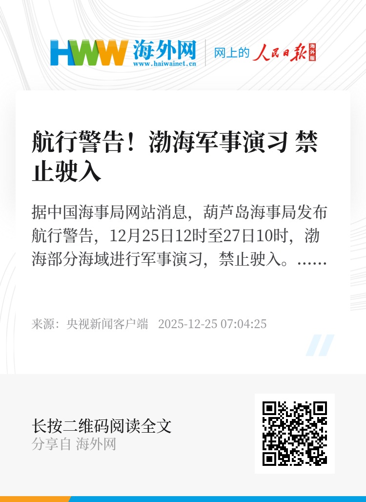据中国海事局网站消息,葫芦岛海事局发布航行警告,12月25日12时至27日10时,渤海部分海域进行军事演习,禁止驶入。
