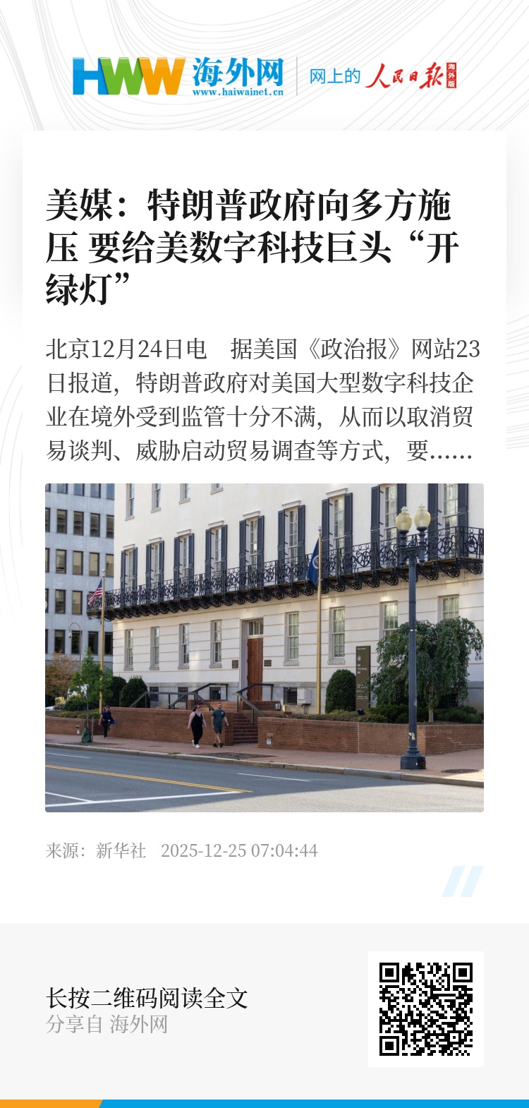 新华社北京12月24日电 据美国《政治报》网站23日报道,特朗普政府对美国大型数字科技企业在境外受到监管十分不满,从而以取消贸易谈判、威胁启动贸易调查等方式,要求欧盟、韩国和英国对这些美国科技巨头“开绿灯”。