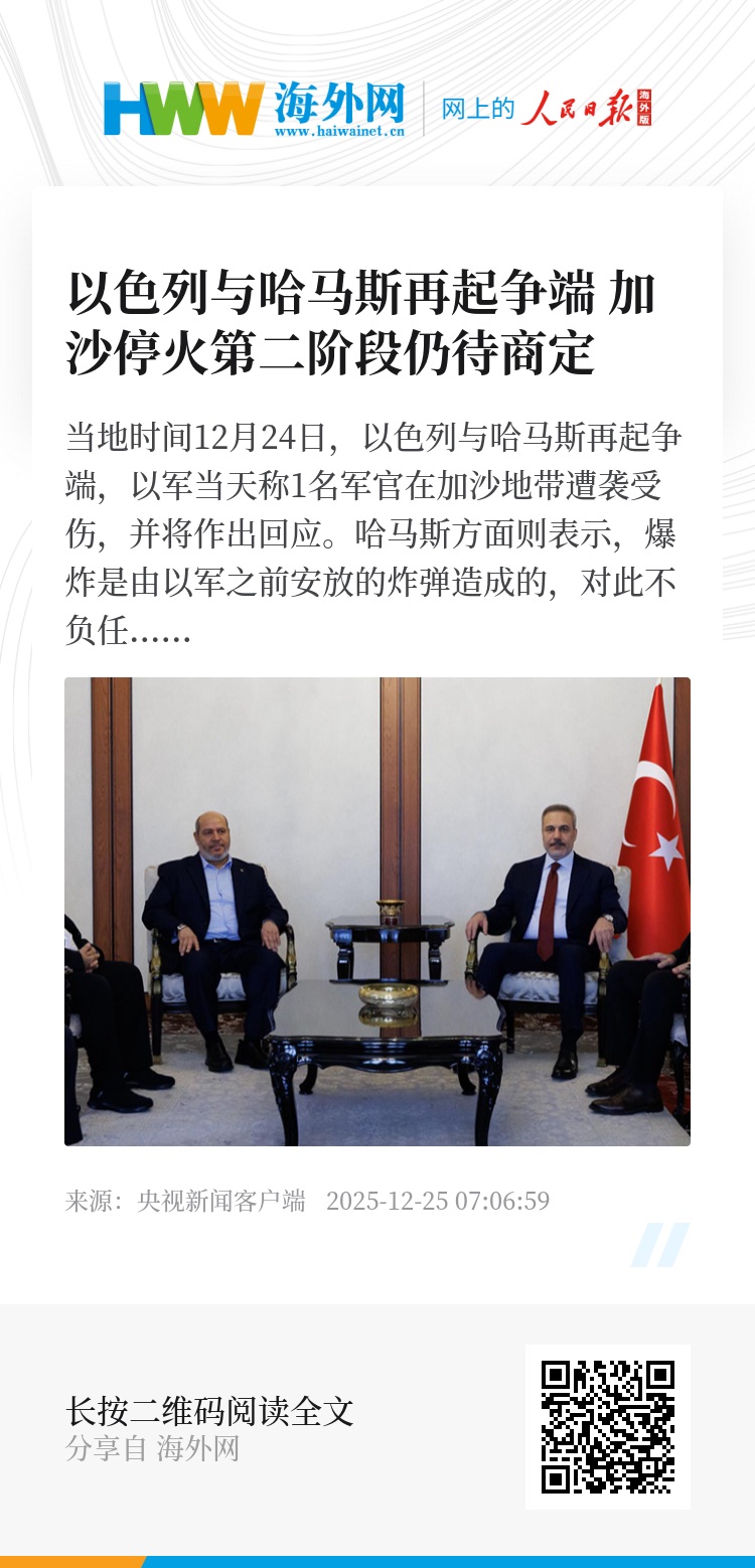此前有消息称,美国总统特朗普计划在本月25日前,宣布加沙和平进程进入第二阶段,公布加沙地带的新治理结构。但截至24日,以色列及哈马斯代表团仍正在就相关内容与斡旋方沟通。