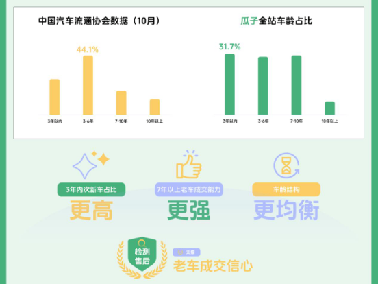 这一结构差异,一方面源于瓜子严格的检测体系和完善的售后保障,使得即便是7年以上的老车,也能够通过透明车况获得消费者信任;另一方面,全国范围内的需求匹配能力,让不同车龄的车辆都能找到最合适的受众。