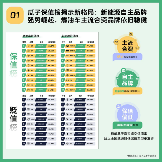 从整体市场来看,二手车价格折损并非线性变化。基于瓜子平台数据测算,燃油车第一年的综合保值率约为66%,折损最为明显;到第三年时整体价格折损接近一半。但在三年之后,折损曲线明显放缓,价格趋于稳定。