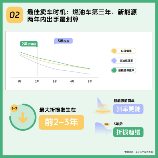 基于这一折损规律,瓜子二手车给出了换车建议。理想的情况下,燃油车用户三年内完成出售,更有利于锁定车辆的剩余价值;而新能源车由于技术更新节奏更快,若在两年内完成置换,既能避免价格快速下行,也能在更短周期内持续享受新技术红利。
