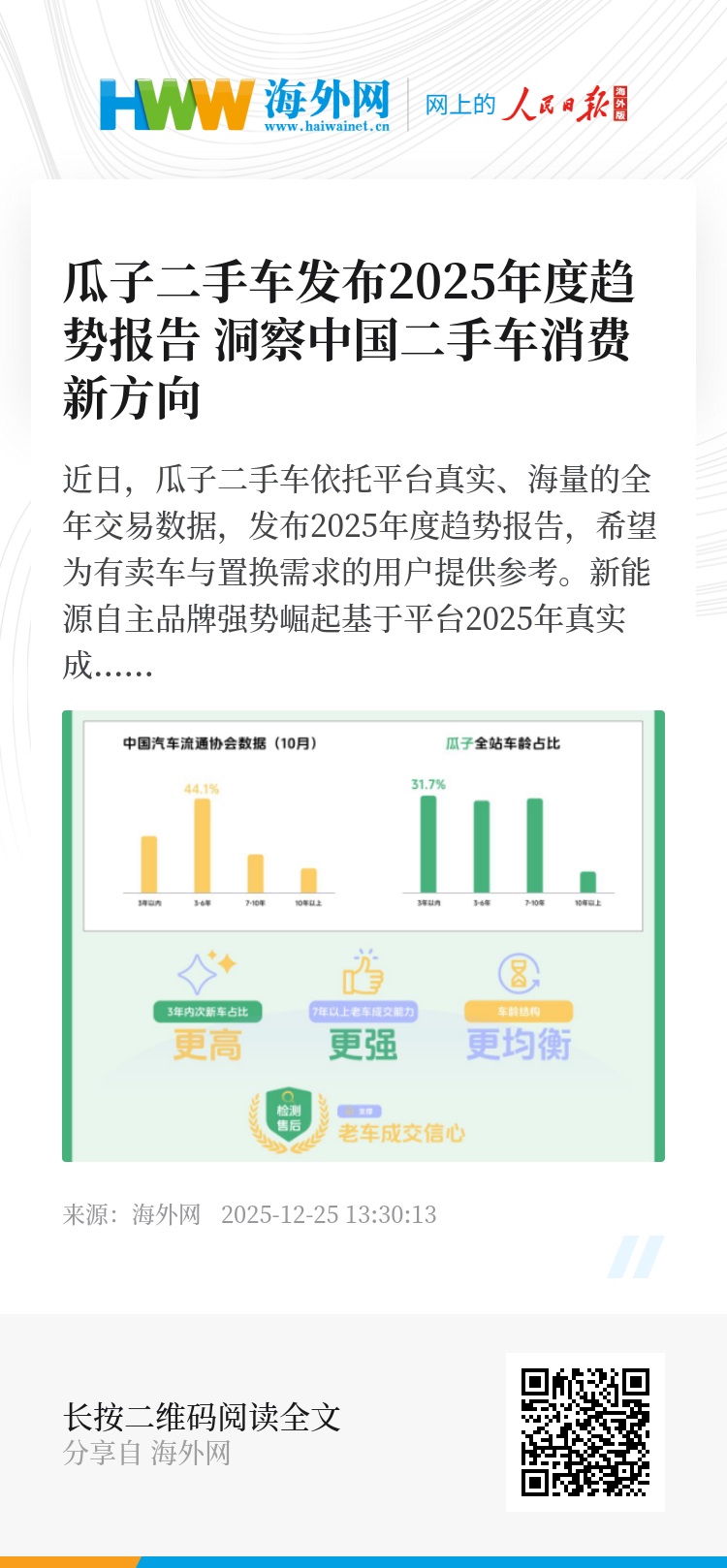 近日,瓜子二手车依托平台真实、海量的全年交易数据,发布2025年度趋势报告,希望为有卖车与置换需求的用户提供参考。