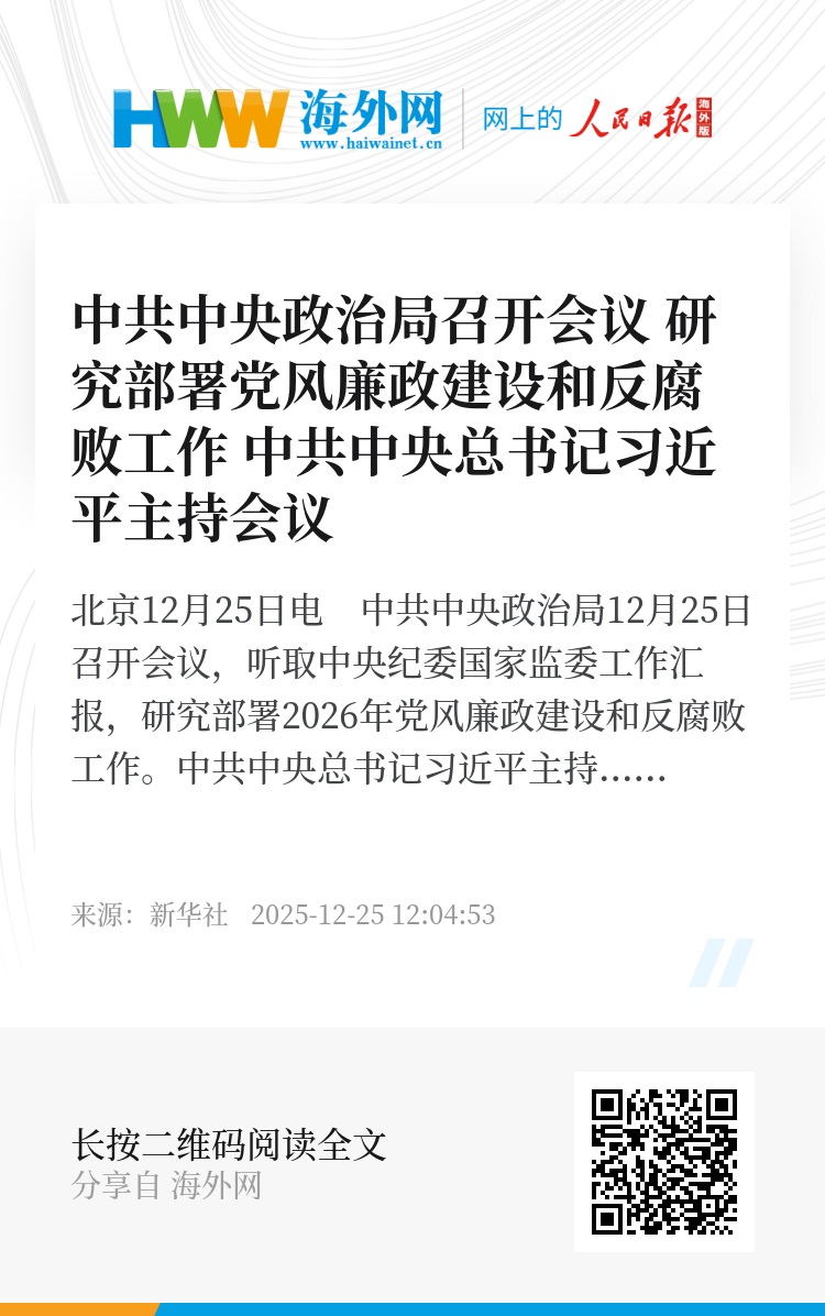 新华社北京12月25日电 中共中央政治局12月25日召开会议,听取中央纪委国家监委工作汇报,研究部署2026年党风廉政建设和反腐败工作。中共中央总书记习近平主持会议。