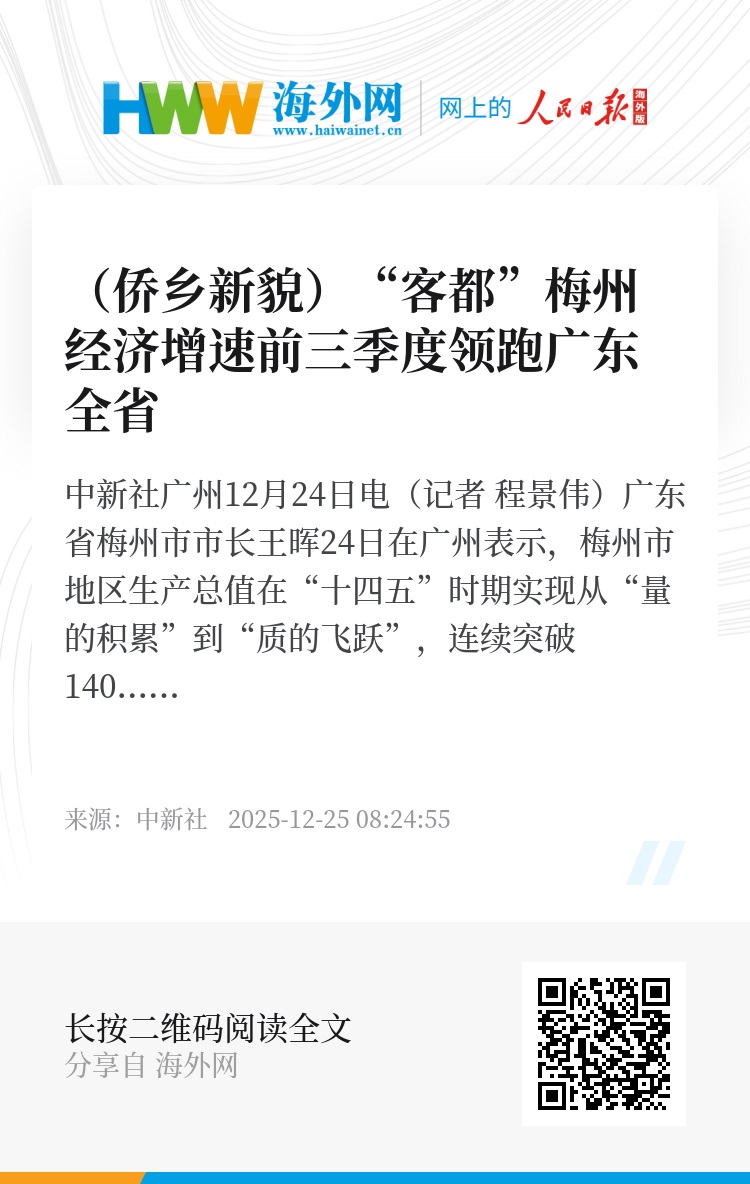 中新社广州12月24日电(记者 程景伟)广东省梅州市市长王晖24日在广州表示,梅州市地区生产总值在“十四五”时期实现从“量的积累”到“质的飞跃”,连续突破1400亿元(人民币,下同)、1500亿元关口,预计2025年将达到1600亿元左右。