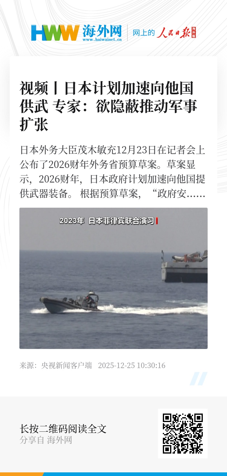 中国社科院日本研究所政治研究室助理研究员 孟明铭:日本政府的这种策略既规避了直接违反宪法第九条的政治风险,又实质性地提升了日本在潜在冲突中的介入能力。长远看,日本正通过渐进、隐蔽但高度连贯的政策组合,悄然完成从和平国家到军事输出国的一种身份转换,而这必然会对未来的亚洲安全格局产生更多不确定性的影响。