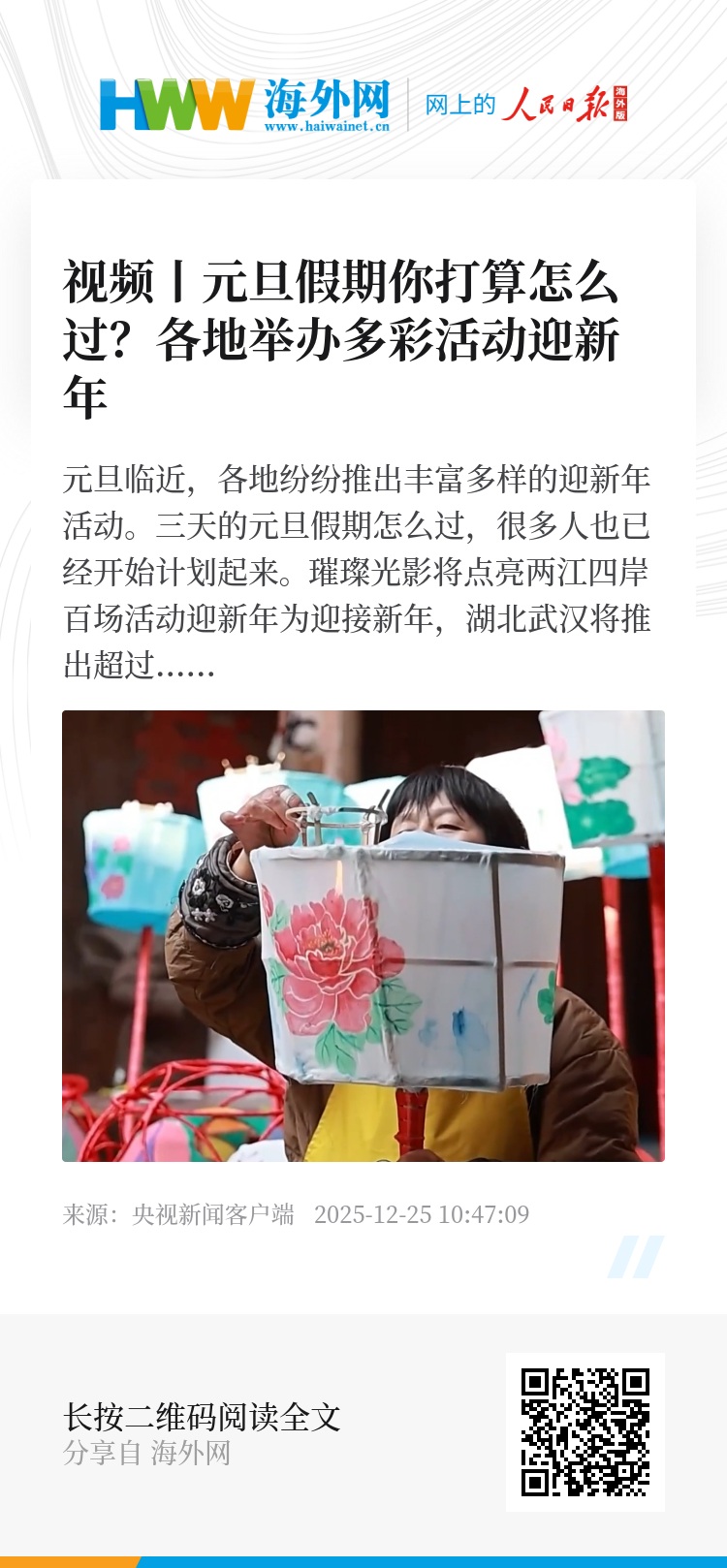 为迎接新年,湖北武汉将推出超过120项文旅活动,其中最大亮点为“两江四岸”跨年光影秀。江汉关将首次融合激光秀、交响乐与新年钟声,上演跨年盛典;黄鹤楼、晴川阁、东湖之眼等九大地标,与长江两岸12栋高楼共同点亮,呈现元旦专属灯光秀。市民游客可登上游轮,在江上看演出、赏夜景。