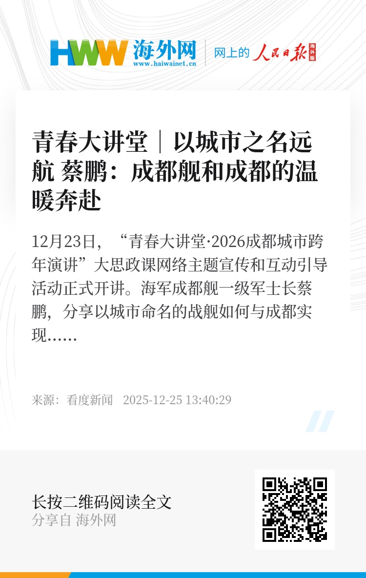 12月23日,“青春大讲堂·2026成都城市跨年演讲”大思政课网络主题宣传和互动引导活动正式开讲。海军成都舰一级军士长蔡鹏,分享以城市命名的战舰如何与成都实现跨越山海的“拥抱”,诠释“双拥”精神在新时代的生动实践。