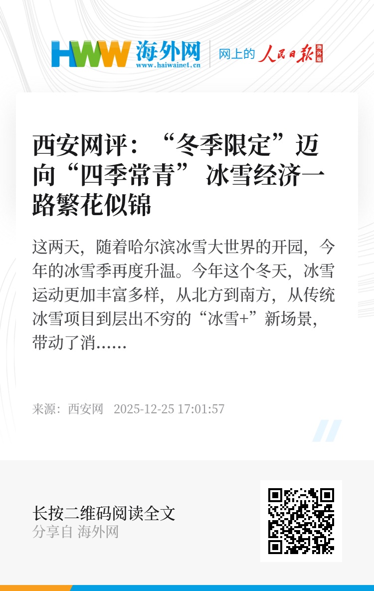 站在万亿门槛上眺望,中国冰雪经济一路繁花似锦。当冰雪经济正成为全民向往的美好生活,冷资源持续释放热能量,让冰天雪地支撑起了高质量发展的金山银山。未来,随着更多地方文旅创新,冰雪经济不再限定于冬季,而是四季皆可,这必然书写出地方文旅发展的新篇章。(西安网特约评论员刘颂寒)