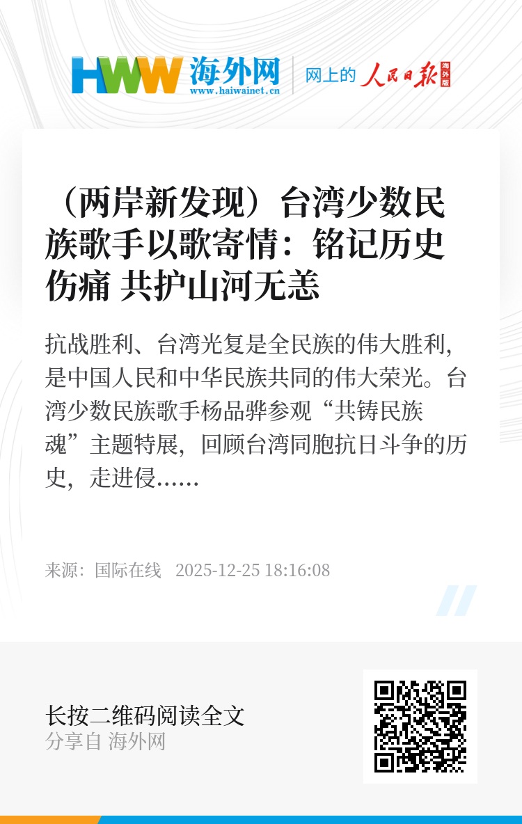 抗战胜利、台湾光复是全民族的伟大胜利,是中国人民和中华民族共同的伟大荣光。台湾少数民族歌手杨品骅参观“共铸民族魂”主题特展,回顾台湾同胞抗日斗争的历史,走进侵华日军第七三一部队罪证陈列馆,向台湾同胞讲述日本侵略者的罪行。他还深情演唱电影《731》主题曲《愿你再见我时》,希望通过歌声让两岸同胞铭记历史、共创未来。