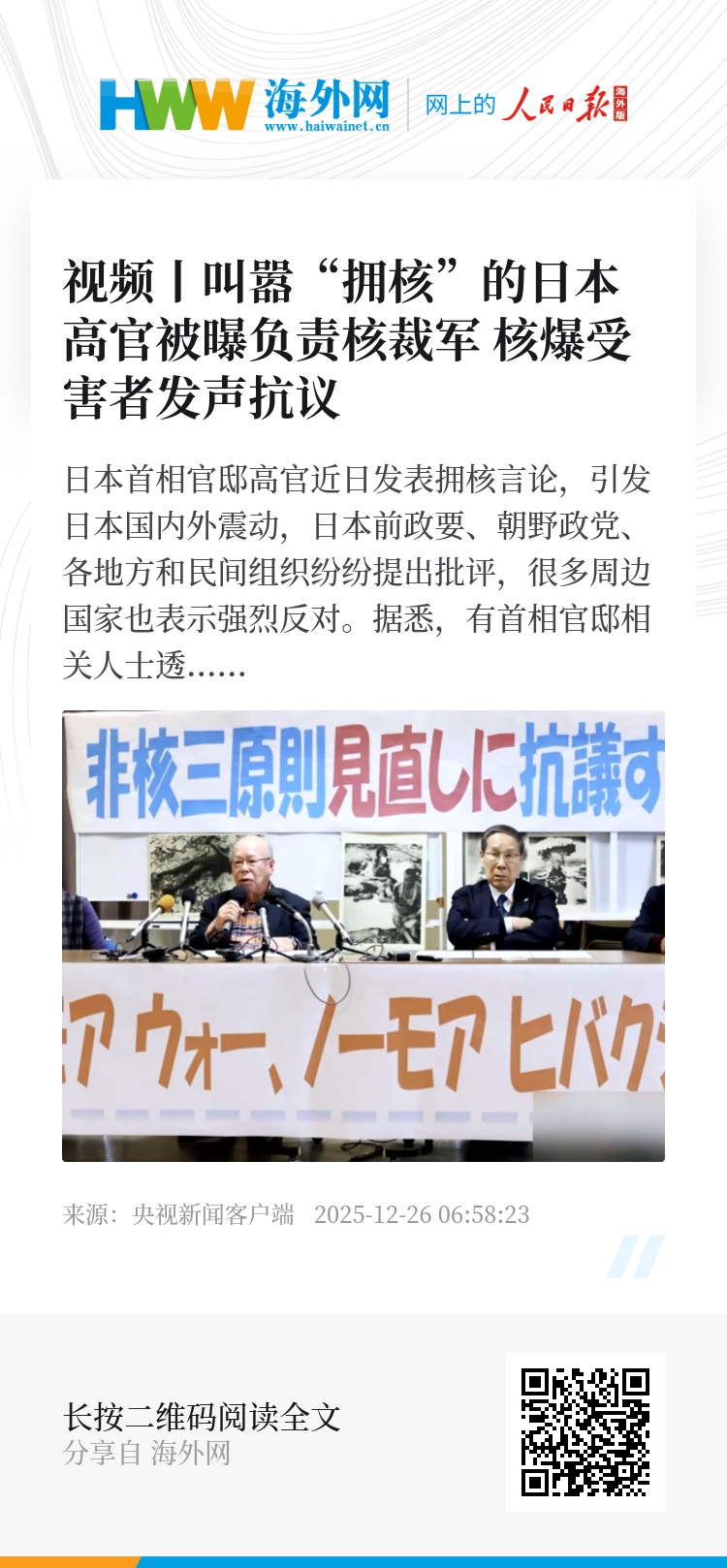 日本首相官邸高官近日发表拥核言论,引发日本国内外震动,日本前政要、朝野政党、各地方和民间组织纷纷提出批评,很多周边国家也表示强烈反对。据悉,有首相官邸相关人士透露,发表该言论的是日本首相高市早苗的亲信、首相辅佐官尾上定正,此人正是负责核裁军、核不扩散事务。