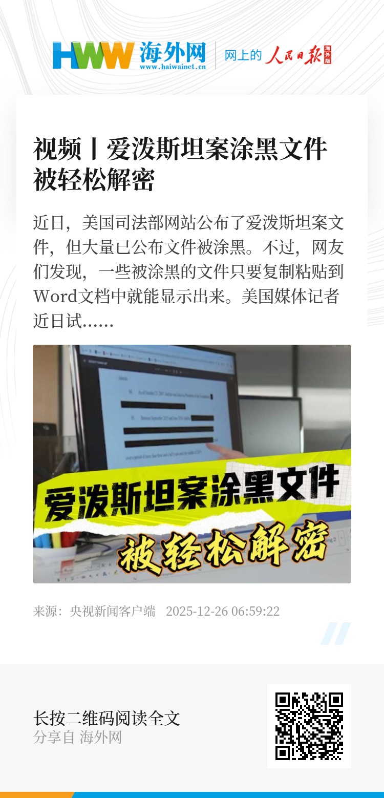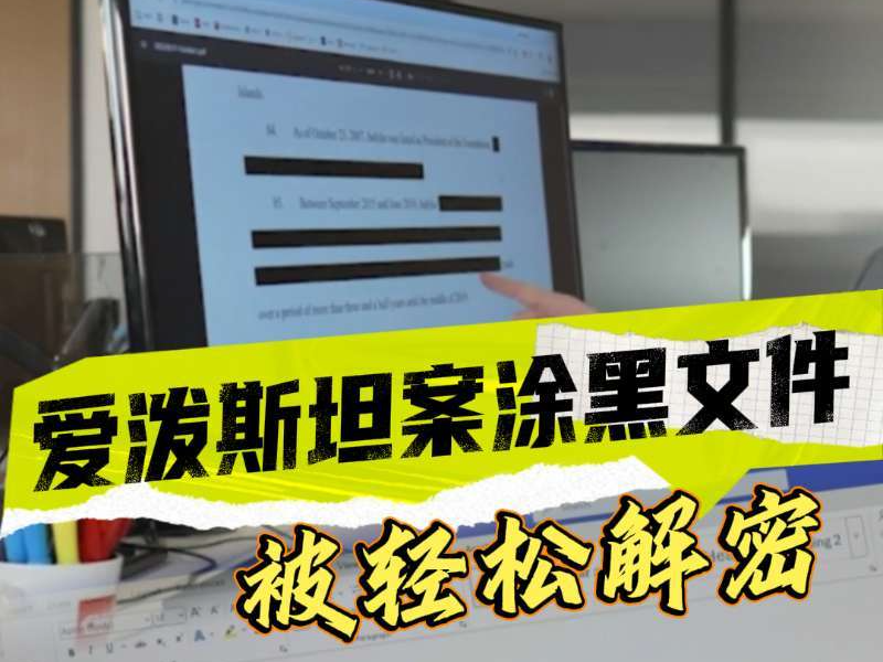近日,美国司法部网站公布了爱泼斯坦案文件,但大量已公布文件被涂黑。不过,网友们发现,一些被涂黑的文件只要复制粘贴到Word文档中就能显示出来。美国媒体记者近日试了网友的方法,果然轻松“破解”了一份文件,看到了被涂黑覆盖的内容。