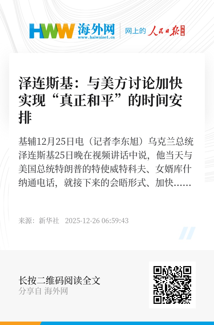 新华社基辅12月25日电(记者李东旭)乌克兰总统泽连斯基25日晚在视频讲话中说,他当天与美国总统特朗普的特使威特科夫、女婿库什纳通电话,就接下来的会晤形式、加快实现“真正和平”的时间安排等议题进行讨论。