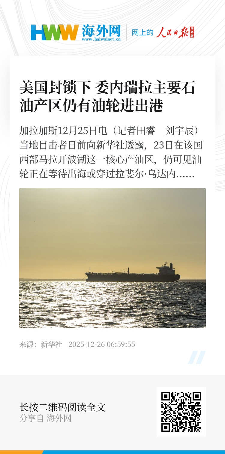 新华社加拉加斯12月25日电(记者田睿 刘宇辰)当地目击者日前向新华社透露,23日在该国西部马拉开波湖这一核心产油区,仍可见油轮正在等待出海或穿过拉斐尔·乌达内塔将军大桥进入巴霍格兰德港口。