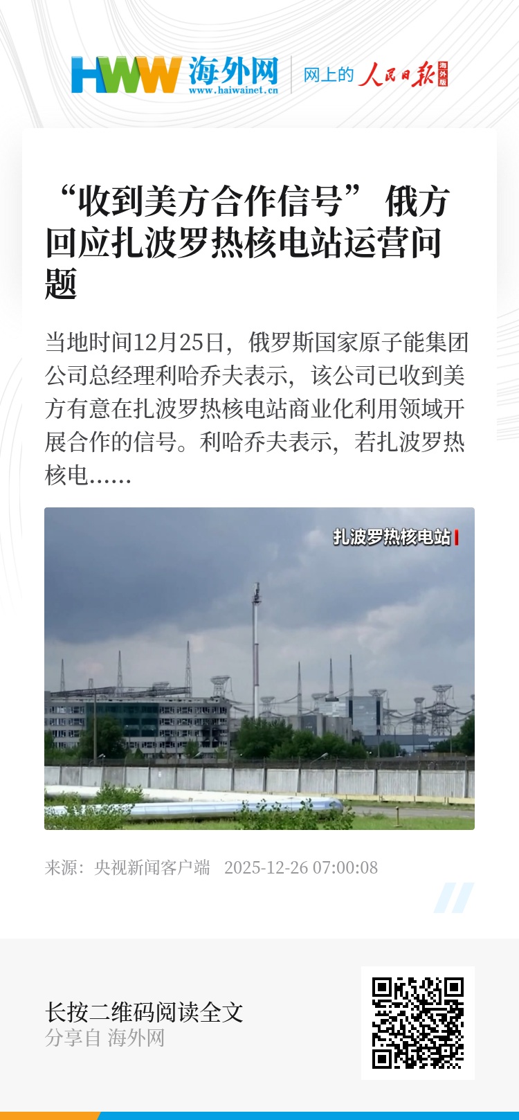 当地时间12月25日,俄罗斯国家原子能集团公司总经理利哈乔夫表示,该公司已收到美方有意在扎波罗热核电站商业化利用领域开展合作的信号。