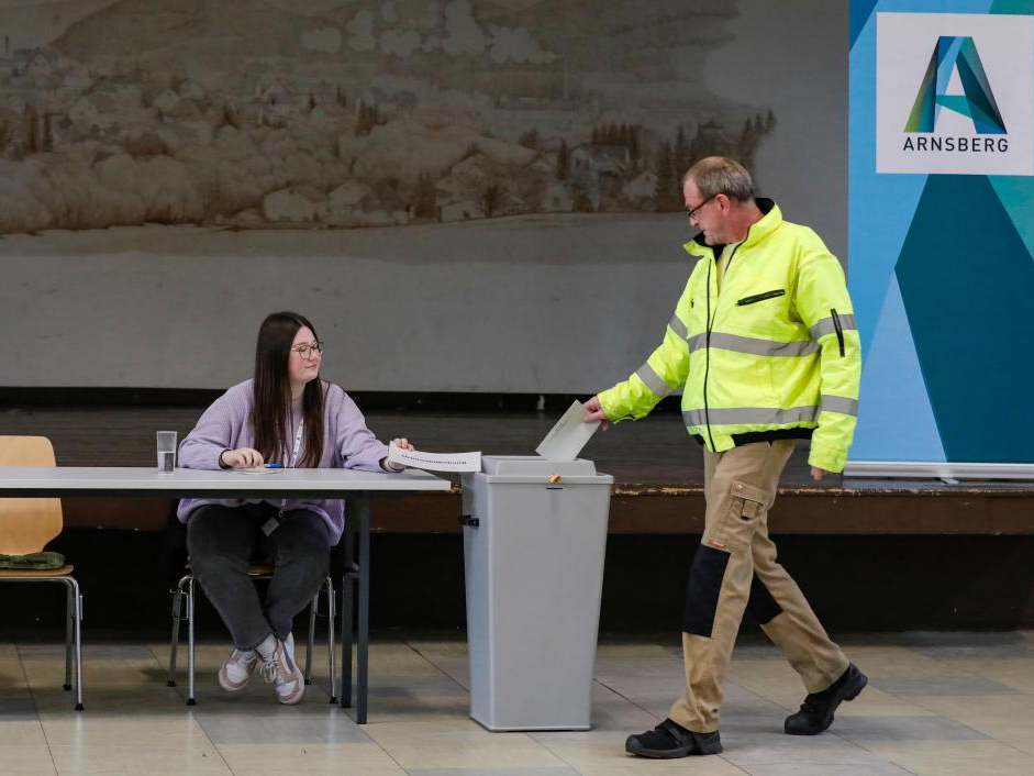 2月23日,德国新一届联邦议院选举投票开始。图为在德国北莱茵-威斯特法伦州阿恩斯贝格,选民在一处投票站投票。新华社记者 张帆 摄