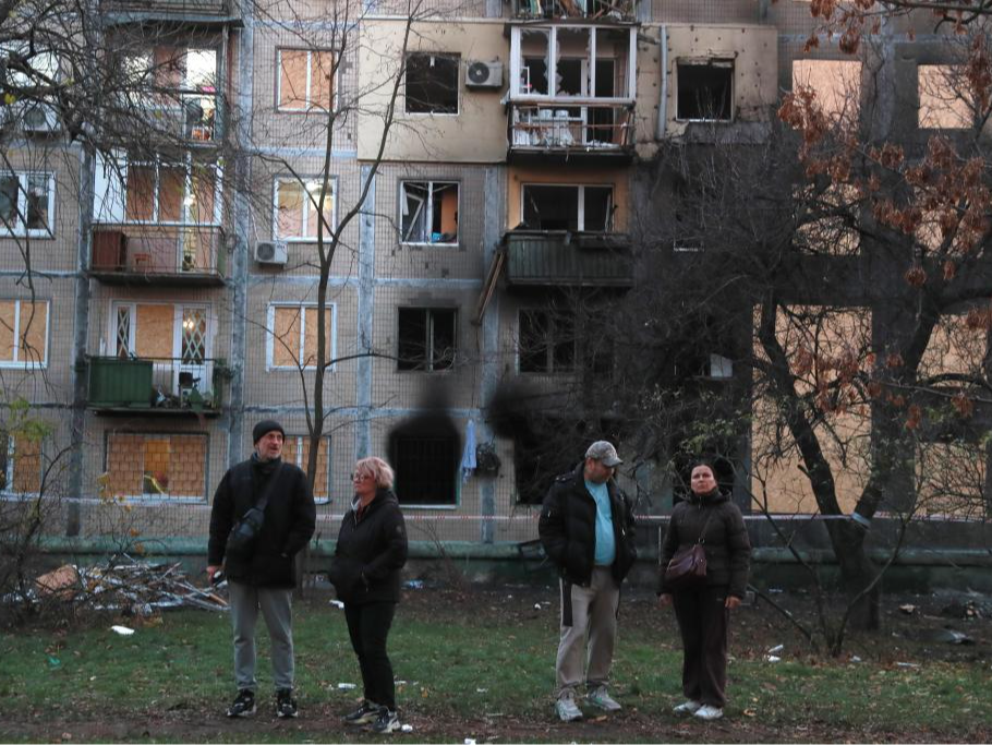 11月14日,在乌克兰首都基辅市第聂伯区,当地居民站在受空袭损毁的房屋前。新华社记者李东旭摄