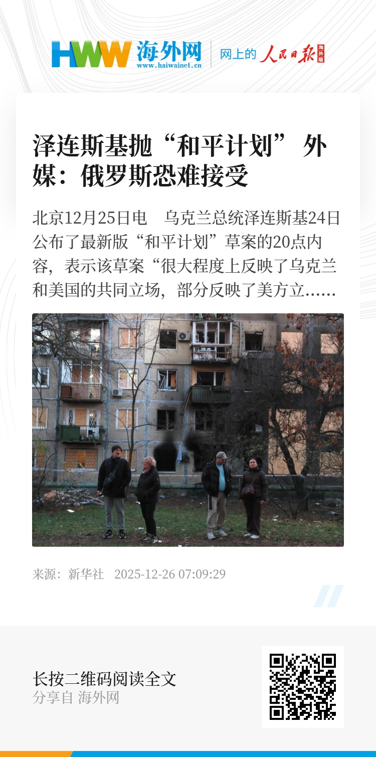 新华社北京12月25日电 乌克兰总统泽连斯基24日公布了最新版“和平计划”草案的20点内容,表示该草案“很大程度上反映了乌克兰和美国的共同立场,部分反映了美方立场”。媒体和分析人士认为,草案对一些关键问题的安排,恐怕很难被俄方接受。