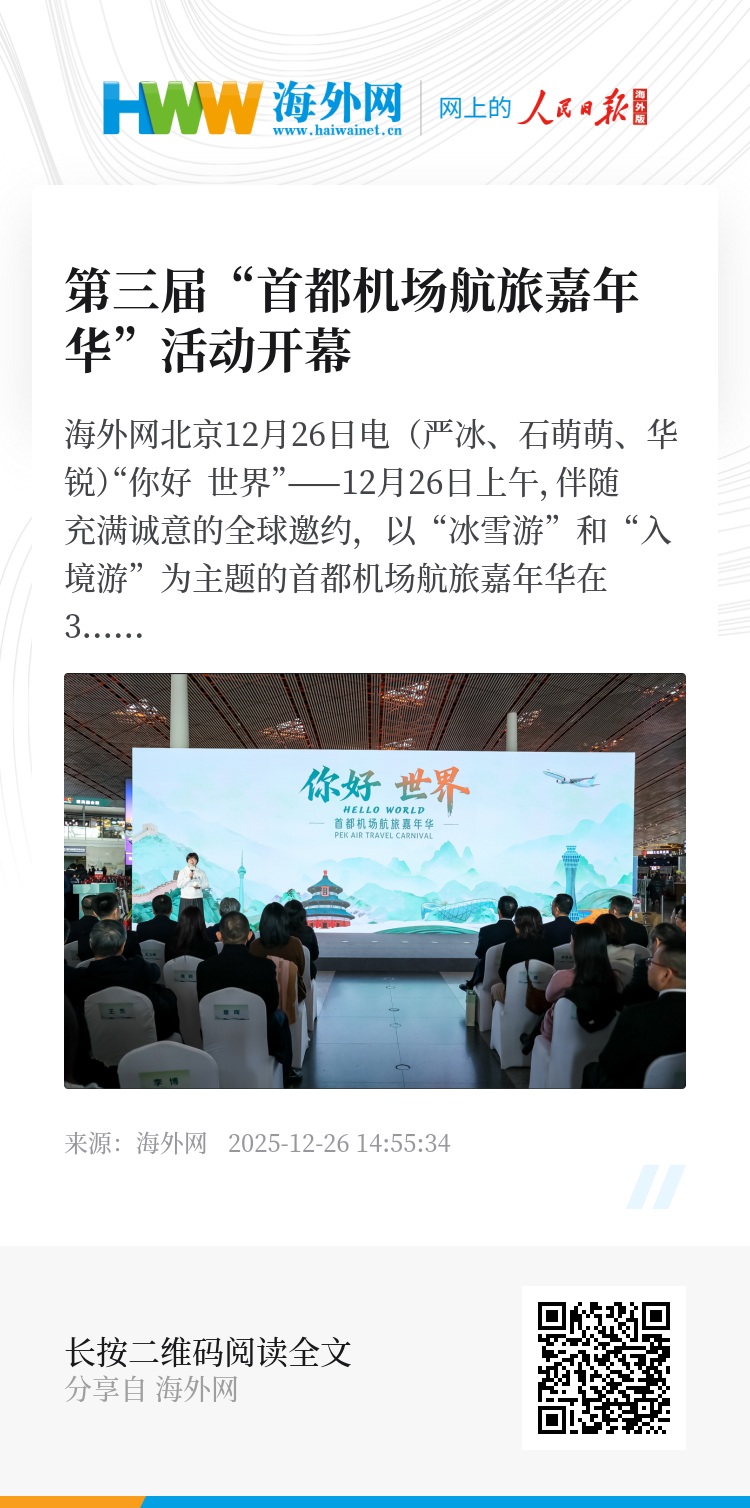海外网北京12月26日电(严冰、石萌萌、华锐)“你好 世界”——12月26日上午,伴随充满诚意的全球邀约,以“冰雪游”和“入境游”为主题的首都机场航旅嘉年华在3号航站楼盛大启幕。本次活动由首都机场联合北京市文化和旅游局、首都机场临空经济区管委会、驻场联检单位、各大航空公司及在线商旅平台等30余家单位共同举办。为期3天的线下活动与贯穿至年底的线上惊喜联动,将为全球旅客呈现一场集产品发布、互动体验、福利派送于一体的航旅盛会。